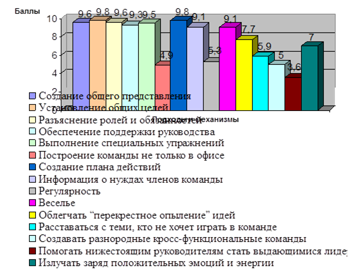 Наиболее эффективным в первой группе подходов и механизмов создания успешной команды, по мнению участников опроса, оказались такие подходы, как «установление общих целей» и «создание плана действий» – по 9,8 баллов. На второе место по эффективности были поставлены два подхода: «создание общего представления» и «разъяснение ролей и обязанностей» – по 9,6 баллов. Следующим идет подход, который звучит как «выполнение специальных упражнений» – 9,5 балла. Чуть менее эффективным подходом участники опроса считают «обеспечение поддержки руководства» – 9,3 балла. Также к числу эффективных подходов отнесены такие, как получение информации о нуждах членов команды и веселье – по 9,1 баллу. Наименее эффективным является подход, заключающийся в помощи нижестоящим руководителям стать выдающимися лидерами.