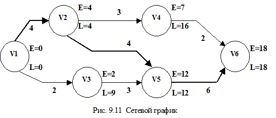 Полное время осуществления проекта равно 18, критический путь будет V1 - V2 - V5 - V6 . Звездочкой в последней колонке помечены величины, которые соответствуют работе, принадлежащей критическому пути.