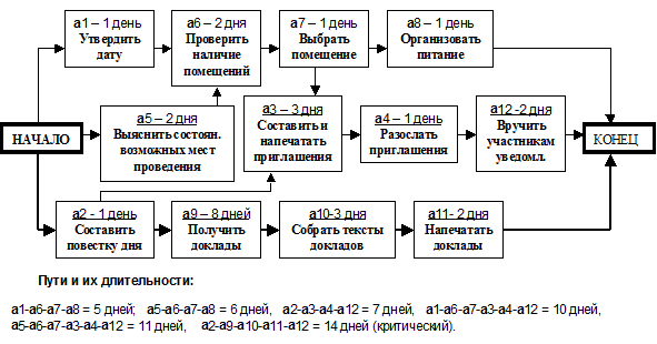 В представленном графике, в отличие от предыдущих, фиксируются два события НАЧАЛО и КОНЕЦ. Работы представлены узлами сети (прямоугольниками), где кроме названия работы указана и ее продолжительность. Стрелки соединяют предшествующие и последующие работы, фиксируя, таким образом, их последовательность. Такое представление позволяет просчитывать суммарную продолжительность работ, входящих в одну цепочку (принадлежащих одному пути), определять критический путь и список работ в него входящих.