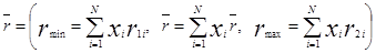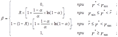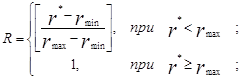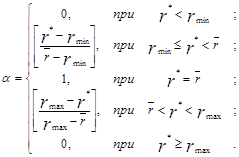 Для оцінки портфельного ризику зробимо деякі припущення. Хай r*= const– критичне значення прибутковості портфеля. Якщо фактичне значення прибутковості r виявиться нижче за r*, то вважається, що стратегія управління портфелем власності була розроблена з помилками. При цьому ступінь ризику збитків конкретного бізнесу в припущенні про те, що показник економічного ефекту бізнесу – трикутне нечітке число, будемо визначати за формулами: