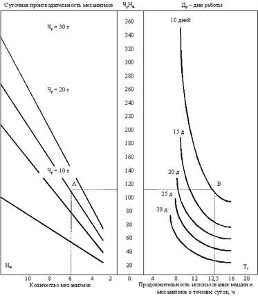 Для этого из точки Нн 6 ед. на оси абсцисс восстанавливаем перпендикуляр до пересечения с прямой, соответствующий часовой производительности Чр = 20 т в час. Через точку А проводим прямую, параллельную оси абсцисс, до пересечения с кривой Др = 10 дней, в результате чего получаем точку В. Перпендикуляр, опущенный из точки В на ось абсцисс правого семейства кривых номограммы, дает искомую величину Тс = 12,5 ч.