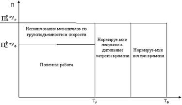Абсцисса диаграммы характеризует использование машин по времени, ордината – по производительности. Площадь графика (полезная работа) характеризует использование машин по времени и по производительности. Как видно из диаграммы, чтобы охарактеризовать работу машин по интенсивности и продолжительности их использования, целесообразно применять коэффициент эффективности загрузки: