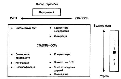 Анализ внешней и внутренней среды, тенденций их развития, потенциальных потребностей и потенциальных возможностей служит основанием для выработки альтернативных вариантов стратегии организации, стратегических решений и выбора среди них альтернативного варианта, который и станет стратегией организации на долговременную перспективу.