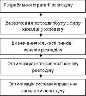 Процес управління розподільчою діяльністю підприємства можна представити у вигляді етапів: визначенні каналів розподілу; виборі посередників; організації поставок; стимулюванні діяльності посередників; контролі діяльності посередників. Для нормального функціонування логістичної системи необхідне існування механізму, який стоїть вище за логістичну систему, який би керував її діяльністю, контролював та корегував дії, спрямовував логістичні потоки, приймав рішення та відповідав за результати їх виконання.