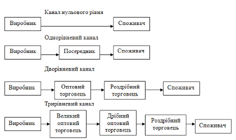 Опосередковані – переміщення товарів через посередників – канали розподілу використовуються фірмами для збільшення ринків збуту, кращого їх охоплення, нарощування обсягів продажу товарів.