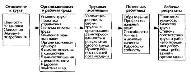 Ниже на рисунке схематически представлен процесс трансформации отношения к труду, с которым человек приходит в организацию, в мотивацию труда. Эта трансформация происходит под влиянием организационной и рабочей среды, то есть тех условий, в которых протекает работа. В какой степени работник реализует свой потенциал в труде на благо компании, какие рабочие результаты мы можем получить от него - это зависит от того, насколько сильной будет его трудовая мотивация (удовлетворенность заинтересованность в конечных результатах и приверженности организации), которая формируется в процессе работы в организации.