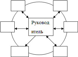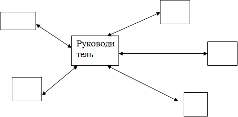 Схема "колесо" (рис.3) хорошо зарекомендовала себя в небольших социальных организациях или в подразделениях средних социальных организаций с неустойчивой номенклатурой выпуска и рынками сбыта, на которых имеется четкое разделение функциональных обязанностей среди профессиональных работников. Руководитель реализует линейные (административные) воздействия, а работники выполняют положенные им функциональные обязанности.