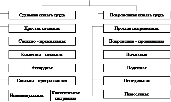Наиболее распространены на предприятиях различных форм собственности две формы оплаты труда: сдельная – оплата за каждую единицу продукции или выполненный объем работ и повременная – оплата за отработанное время, но не календарное, а рабочее, нормативное, которое регулируется законом. И сдельную и повременную формы оплаты труда можно представить как системы (см. рис. 1).