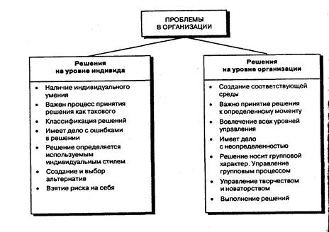 В управлении организацией принятие решений осуществляется менеджерами различных уровней и носит достаточно формализованный характер, так как решение касается не только одной личности, а чаще всего оно относится к подразделению или к организации в целом. Выделяют два уровня решений в организации: индивидуальный и организационный.