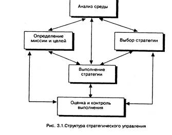 Стратегическое управление можно рассматривать как динамическую совокупность пяти взаимосвязанных управленческих процессов. Эти процессы логически вытекают один из другого. Однако существует устойчивая обратная связь и, соответственно обратное влияние каждого процесса на остальные и на всю их совокупность. Это является важной особенностью системы стратегиче кого управления. Схематически структура стратегического управления изображена на рис.