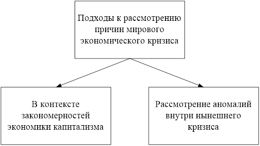 Первый подход основывается на трактовке современного кризиса в контексте зафиксированных историей закономерностей, свойственных экономике капитализма. Считается возможным применение и сегодня хорошо известных науке методов анализа изменений в экономике как повторяющихся событий. Второй подход базируется на ощущении наличия серьезных аномалий внутри нынешнего кризиса в сравнении с теми обычными кризисами – текущими (3-5 лет), среднесрочными (с периодичностью 8-12 лет), долгосрочными циклами 50-летней размерности. В рамках данного направления изучения кризиса выделяются экспертные группы, склонные к апокалипсической трактовке начавшегося социально-экономического обрушения. С самого начала нынешний кризис прописался в литературе в качестве кризиса финансового, лишь позже перешли к изучению его связи с иными процессами в экономике, а затем и к более широким контекстам, затрагивающим социальные отношения и области морали и нравственности. Нынешний финансовый кризис отличается как глубиной, так и размахом — он, пожалуй, впервые после Великой депрессии охватил весь мир. «Спусковым крючком», приведшим в действие кризисный механизм, стали проблемы на рынке ипотечного кредитования США. Однако в основе кризиса лежат более фундаментальные причины, включая макроэкономические, микроэкономические и институциональные (рисунк 2).