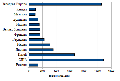 Приведенные на рисунках 5, 6 данные показывают, что ВВП России в 2003 году составлял более 1,3 трлн. дол. и наша страна занимала 10-е место в мире, отставая от США и Западной Европы примерно в 8 раз, от Китая — в 5 раз, от Японии — почти в 3 раза, от Индии — в 2,3 раза, от Великобритании, Италии и Франции — в 1,2 раза, от Бразилии — на 4 %.