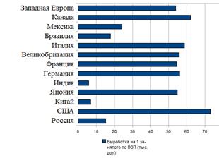 Что касается производительности труда (рисунок 8), то по этому показателю Россия отстает от США практически в 5 раз, от Канады — в 4 раза, от основных стран Западной Европы и Японии — примерно в 3,5–3,7 раза, от Мексики — на 36 %, от Бразилии — на 14 %. Зато мы вдвое превосходим Китай и почти втрое — Индию. В 2003 году доходы населения составляли в России в среднедушевом выражении 4 690 дол., то есть 95 % от среднемирового уровня. Личные доходы в расчете на душу населения в России равнялись 17,9 % от уровня США, 28,8 % от уровня Германии, 29,7 % от уровня Японии и 211,7 % от уровня Китая. После дефолта 1998 года и резкой девальвации рубля в России начался рост производства. Но экономический рост носит экстенсивный характер и происходит прежде всего за счет традиционной неконкурентоспособной продукции. Россия почти не производит современной и высококачественной конкурентоспособной продукции массового спроса гражданского, т. е. невоенного, назначения. Более того, в отличие от новых индустриальных стран и таких крупных развивающихся стран, как Бразилия, Индия и тем более Китай, Россия пока не сумела пробиться на широкий мировой рынок, занять собственные надежные ниши по поставкам готовой, а не сырьевой промышленной и сельскохозяйственной продукции. Россия остается также и страной не доведенных до конца реформ. Большинство неудач в сфере российской экономики и ее реформирования было обусловлено слабостью институтов власти, отсутствием необходимой политической воли к созданию истинно эффективной рыночной экономики и формированию демократического строя. Недостаточный профессионализм, неграмотность и неопределенность в принятии решений, бездеятельность, а порой и прямой саботаж при их выполнении на разных уровнях государственной власти, слияние последней с финансовой и частнопредпринимательской средой превратились в обычное явление в системе нынешнего управления в России. Все это не может не сказаться самым негативным образом на характере развития нашей экономики. [7, 9, 11]