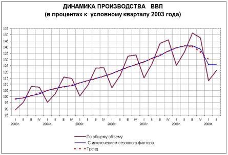 Разразившийся мировой экономический кризис не обошёл стороной и Россию. Резкое падение мировых цен на товары традиционного российского экспорта, снижение доступности дешёвых кредитов в конце 2008 года и начале 2009 спровоцировали обвал на фондовом рынке России, девальвацию рубля, снижение промышленного производства, ВВП (рисунок 9), доходов населения, а также рост безработицы. Антикризисные меры правительства потребовали трат значительной доли международных резервов. В мае 2009 года ВВП России снизился на 11% по отношению к аналогичному месяцу прошлого года. Экспорт упал по сравнению с маем 2008-го на 45 процентов, составив 23,4 млрд. долл. Импорт снизился на 44,6 процента до 13,6 млрд. долл.