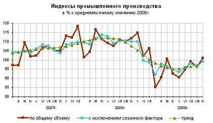 Замедление темпов падения ВВП в сентябре было связано, прежде всего, с началом роста запасов и замедлением падения инвестиций, при этом динамика потребительских расходов по отношению к высокой базе предыдущего года остается достаточно низкой, а восстановление импорта несколько уменьшило положительный вклад чистого экспорта, подчеркивается в документе. Промышленное производство в России (рисунок 10) в январе-сентябре 2009 года сократилось на 13,5% по сравнению с аналогичным прошлогодним периодом. В сентябре 2009 года промышленное производство снизилось на 9,5% по сравнению с сентябрем 2008 года, но возросло на 5,1% по сравнению с августом текущего года.