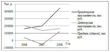 Необходимо отметить, что предприятие не смогло сопротивляться отрицательному влиянию экономического кризиса из-за внутренних проблем, возникших еще до кризиса и не решенных вовремя. Напомним, что в рассматриваемом периоде у предприятия имеется большая кредиторская задолженность, значительная дебиторская задолженность, в предыдущем периоде предприятие не имело прибыли, только убытки. Рассмотрим динамику этих двух характеристик предприятия за последние несколько лет (рисунок 20)