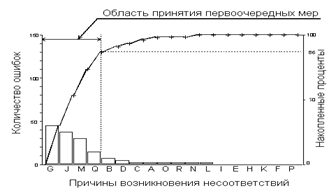 На диаграмме отчетливо видна область принятия первоочередных мер, очерчивающая те причины, которые вызывают наибольшее количество ошибок. Таким образом, в первую очередь, предупредительные мероприятия должны быть направлены на решение проблем именно этих проблем (рис. 3).