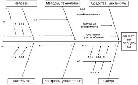 Причинно-следственная диаграмма (диаграмма Исикавы, «рыбий скелет»)- демонстрирует отношения между проблемой и ее возможными причинами. Обеспечивает модель установления связей между проблемой и факторами, влияющими на нее. Причинно-следственная диаграмма полезна для устранения причин появления проблем, а также полезна для понимания эффектов воздействия нескольких факторов на процесс. Анализируется четыре основных причинных фактора: человек, машина (оборудование), материал и метод работ. При анализе этих факторов выявляются вторичные, третичные и т.д. причины, приводящие к дефектам и подлежащие устранению. Для анализа дефектов и построения диаграммы необходимо определить максимальное число причин, которые могут иметь отношение к допущенным дефектам. Такую диаграмму еще называют диаграммой «четыре М» по составу основных факторов (рис. 6).