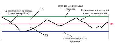 Контрольные карты - специальный вид диаграммы, впервые предложенный В. Шухартом в 1925 г. Контрольные карты имеют вид, представленный на рис. 7. Они отображают характер изменения показателя качества во времени.