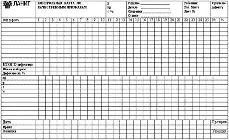 Контрольные листы (или сбор данных) – специальные бланки для сбора данных. Они облегчают процесс сбора, способствуют точности сбора данных и автоматически приводят к некоторым выводам, что очень удобно для быстрого анализа. Результаты легко преобразуются в гистограмму или диаграмму Парето. Контрольные листки могут применяться как при контроле по качественным, так и при контроле по количественным признакам. Форма контрольного листа может быть разной, в зависимости от его назначения (рис. 1).