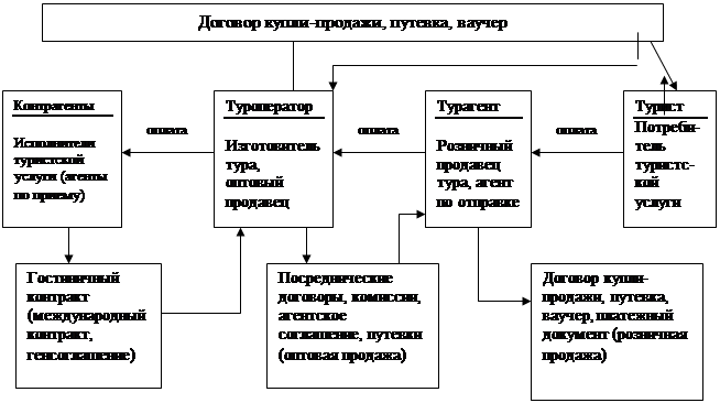 В разработке, представлении и потреблении туристских услуг участвуют следующие субъекты: турист, розничный продавец - турагент, оптовый продавец и изготовитель тура - туроператор, контрагенты туроператора - предприятия и компании, предоставляющие и исполняющие определенные услуги по размещению, питанию, транспортировке, страхованию, экскурсионные услуги, услуги, связанные с оформлением виз, загранпаспортов, бронированию и покупки билетов, и другие, входящие в состав тура. Допускается совмещение одним субъектом, осуществляющим разработку, исполнение и предоставление туристских услуг, нескольких из перечисленных функций. Продавцы и контрагенты несут перед туристами ответственность за качество и безопасность предоставляемых ими туристских услуг.