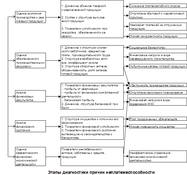 Основним критерієм прояви кризової ситуації на підприємстві є його неплатоспроможність – неможливість підприємства погасити свої зобов'язання. Вона виявляється в порушенні фінансових потоків, що забезпечують виробництво і реалізацію продукції. Причинами неплатоспроможності є фактори, що впливають на зниження чи недостатній ріст виторгу від реалізації і випереджальний ріст зобов'язань. Спад виробництва, ознаки соціального банкрутства, високий ступінь зносу основних засобів, низька ліквідність оборотних коштів - кожної з цих взаємозалежних факторів може стати причиною неплатоспроможності підприємства. Неплатоспроможність виявляється в такім розміщенні і використанні фінансових ресурсів, при якому підприємство на може погасити свої зобов'язання перед кредиторами.