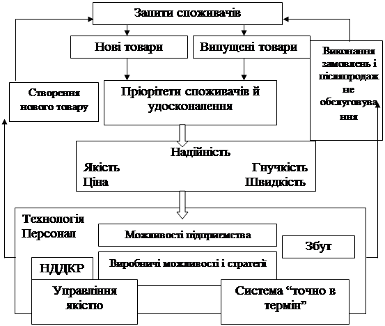 На рис, 1.1. наочно відображена структура взаємозв'язків між запитами споживачів, їхніми пріоритетами щодо технічних характеристик і вимогами до виробничих процесів, а також виробничими й іншими ресурсними можливостями підприємства, призначеними для задоволення цих вимог.