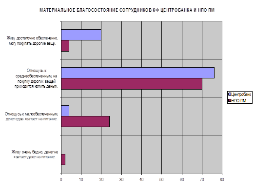 НПО ПМ представляет отрасль, в которой произошло значительное понижение уровня жизни. В иерархии соотносительного уровня зарплаты предприятия военно-промышленного комплекса были вверху, а теперь – внизу. Например, число тех, кто отнес себя к категории малообеспеченных («денег едва хватает на питание»), в НПО ПМ составляет 24% (для сравнения, в Центробанке эта цифра равна 4%). Тем не менее, при резком снижении уровня жизни сотрудники НПО ПМ сохраняют свой профессиональный статус. В такой ситуации мы наблюдаем существенные различия между целями, которые преследует группа, и ресурсами, которыми она обладает (высокостатусные цели и низкостатусные ресурсы).