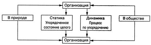 Как видно из приведенной схемы (рис.1.1), организация может рассматриваться в статике и динамике. В статике - это некоторое целостное образование (социальное, техническое, физическое, биологическое), имеющее вполне определенную предназначенность. В динамике она представляется в виде разнообразных процессов по упорядочению элементов, формированию и поддержанию целостности вновь создаваемых или функционирующих природных объектов. Эти процессы могут состоять из целенаправленных действий людей либо из естественных физических процессов, т.е. иметь самоорганизующее начало.