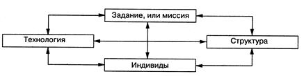 Таким образом, одной из наиболее известных в России и за рубежом точек зрения на выделение факторов внутренней среды, является разработанная М. Месконом, М. Альбертом и Ф. Хедоури теория, согласно которой основными переменными внутренней среды выступают цели, задачи, структура, технология, а также люди (персонал организации). На наш взгляд, эта точка зрения - развитие известной теории "алмаза" Г. Ливитта, который выделил четыре переменные организации: задание, или миссия; структура; технология; индивиды. Исследователь подчеркивал значение каждого элемента и существующих между ними взаимосвязей - изменение в одном из них обусловливает трансформации в других (рис.2.5).