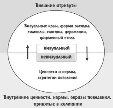 Культура корпорации представляет собой как бы два организационных уровня. На верхнем уровне представлены такие видимые факторы, как одежда, символы, организационные церемонии, рабочая обстановка. Верхний уровень представляет элементы культуры, имеющие внешнее видимое представление. На более глубоком уровне располагаются ценности и нормы, определяющие и регламентирующие поведение сотрудников в компании. Ценности второго уровня тесно связаны с визуальными образцами (слоганами, церемониями, стилем деловой одежды и др.), они как бы вытекают из них и обозначают их внутреннюю философию. Эти ценности поддерживаются и вырабатываются сотрудниками организации, каждый работник компании должен разделять их или хотя бы показывать свою лояльность по отношению к принятым корпоративным ценностям.