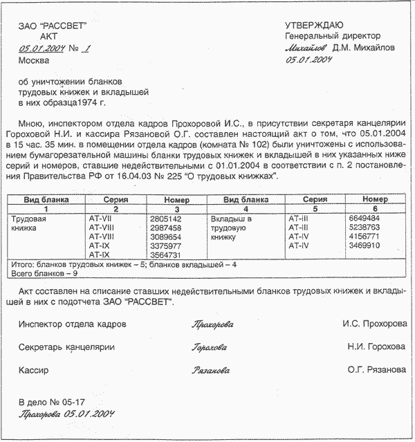 Акт по уничтожению бланков