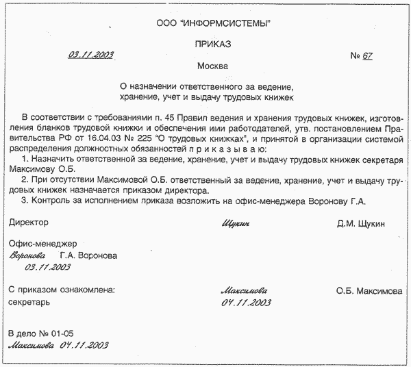 о назначении ответственного за работу с трудовыми книжками