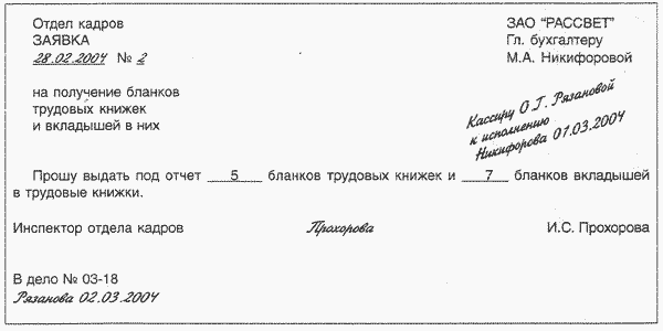 Заявка на получение бланков трудовых книжек и вкладышей в них