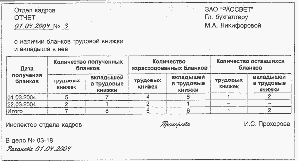 Отчет о наличии бланков трудовой книжки и вкладыша в нее