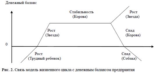 После прохождения точки кризиса стабильности денежные поступления начинают уменьшаться, что приводит к спаду. Далее возможны два варианта развития событий. Если владельцы и менеджеры предприятия проводят его реструктуризацию (что, как правило, требует финансовых вложений), то предприятие переходит в категорию "Звезда". Если же реструктуризация не проводится, то до точки нулевого денежного баланса предприятие по прежнему находится в категории "Корова", а ниже ее переходит в категорию "Собака". Денежные поступления становятся меньше расходов на текущую деятельность и для дальнейшего существования предприятия необходима дополнительная денежная подпитка. Если она не осуществляется, то заканчивается это ликвидацией предприятия.