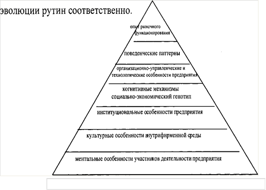 В основании пирамиды располагается фундаментальная группа уровней, изменения в которых проходят медленно, вследствие глубокого укоренения данных организационных рутин во внутренней среде организации. К ним относят ментальные особенности участников деятельности предприятия, культурные особенности внутрифирменной среды, институциональные особенности предприятия, когнитивные механизмы. В совокупности они формируют социально-экономический генотип, т.е. признаки, наследуемые организацией. В верхней части пирамиды расположены функциональные уровни, изменения в которых происходят в более короткие сроки. К подобным подвижным слоям относят организационно-управленческие и технологические признаки предприятия, поведенческие паттерны, опыт рыночного функционирования. Находясь в постоянном взаимодействии друг с другом, данные организационные рутины представляют предпосылки для эволюционного развития организации.