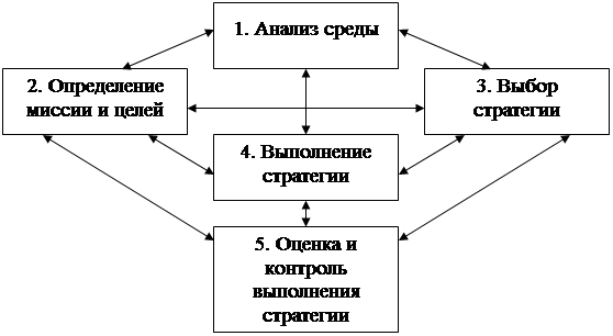 Итак, стратегическое управление — это процесс принятия и осуществления стратегических решений, центральным звеном которого является стратегический выбор, основанный на сопоставлении собственного ресурсного потенциала предприятия с возможностями и угрозами внешнего окружения, в котором оно действует.