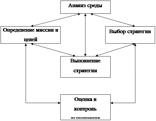 Стратегическое управление можно рассматривать как динамическую совокупность пяти взаимосвязанных управленческих вопросов. Эти процессы логически вытекают один из другого. Однако существует устойчивая обратная связь и, соответственно обратное влияние каждого процесса на остальные и на всю их совокупность. Это является важной особенностью системы стратегического управления. Схематически структура стратегического управления изображена на рис. 1.1. [10, с.39]