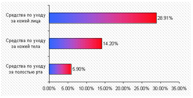Крупнейшими сегментами рынка остаются средства по уходу за кожей (24,9% от общей емкости рынка) и средства по уходу за телом (22,6%). За ними следуют средства по уходу за полостью рта и декоративная косметика, доля которых в общей емкости рынка составляет 10,9% и 10,5% соответственно.