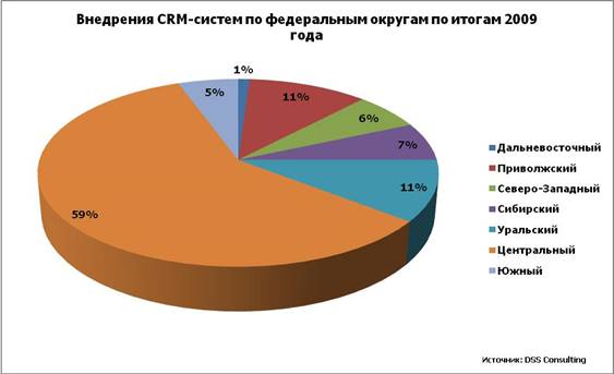 В современных условиях, когда конкуренция на многих рынках в РФ стала довольно жесткой, остро встает вопрос активного управления продажами. Клиентоориентированная технология стала средством выживания компании на рынке и оружием в конкурентной борьбе. Так, например, на проходившей в феврале 2004 года выставке «Торговые технологии и Склад-Экспо» уже примерно каждый второй руководитель торгового предприятия, подходивший к стенду фирмы «1С», интересовался CRM. Сейчас спрос на технологии CRM со стороны российского бизнеса намного выше. Количество выставок и конференций, посвященных тематике CRM, растет год от года, а счет проектов внедрения CRM в России идет уже на тысячи. Если экспертные оценки российского рынка (это эксперты таких крупных производителей как: 1С-Рарус, Terrasoft, Sputnic Labs, SAP и др.) приписать равные веса, то получающееся среднее ощущение объема российского рынка CRM в 2007 году равно примерно $80 млн. Соотношение проектов внедрений CRM-систем по федеральным округам и по отраслям можно посмотреть в Приложении 1.