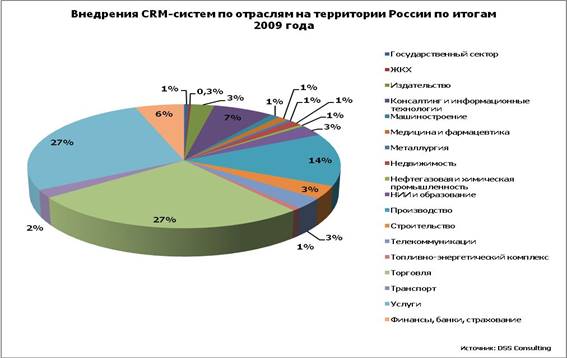 В обзоре российского рынка CRM за 2005-2008 годы от DSS Consulting рассмотрено 24 отечественных и иностранных CRM-системы и более 500 подтвержденных проектов внедрения CRM-систем. В качестве метрики в исследовании используется количество успешных (подтвержденных клиентами или публикациями в прессе и интернет) проектов внедрения.