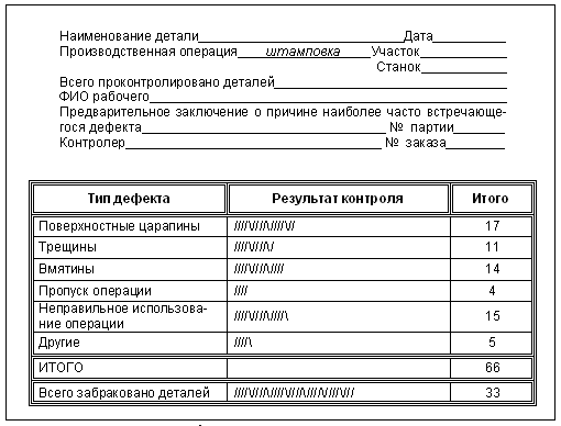 Существует огромное количество учетных регистров, варьируемых на различных предприятиях в зависимости от рода деятельности, типа выпускаемой продукции и т.п. (табели, отчеты о расходах, заказы на поставку, отчеты о переделке продукции и т.д.). В качестве примера можно привести регистрацию дефектов контролером ОТК штампованной пластиковой детали. Данная форма позволяет видеть причины брака и быстро определять нанесенный им ущерб и его виновника.