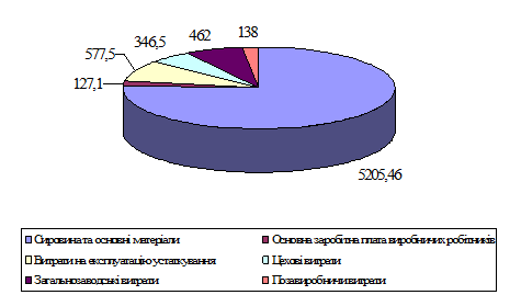 Відстежено, що велику частину собівартості склали матеріальні витрати (76%). Набагато менше склали витрати на експлуатацію устаткування (8%). 7% склали загальнозаводські витрати, 5% - комерційні, по 2% склали цехові витрати і витрати на оплату праці.