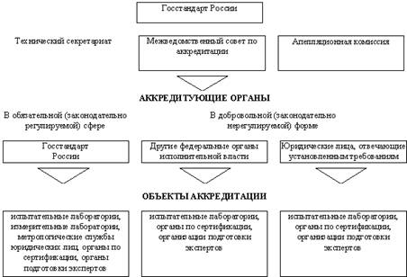 Развитие деятельности по сертификации в промышленной сфере отечественной экономики создало предпосылки и обусловлю необходимость создания свода правил по аккредитации различных объектов (органов по сертификации, испытательных и измерительных лабораторий). В этих целях был сформирован комплекс требований, применяемых в РФ к системам аккредитации объектов, осуществляющих оценку соответствия, включая испытания, измерения и сертификацию в обязательной (законодательно регулируемой) и добровольной сферах. В настоящее время Российская система аккредитации (РОСА) регламентирована комплексом государственных стандартов. В этих стандартах реализованы положения законов РФ "О защите прав потребителей", "О сертификации продукции и услуг", "Об обеспечении единства измерений" в части аккредитации испытательных и измерительных лабораторий, органов по сертификации, а также руководств ИСО/МЭК 55, ИСО/МЭК 38, ИСО/МЭК 40, европейских стандартов Е серии 45000 и работ Международной конференции по аккредитации испытательных лабораторий (ИЛАК). Объектами аккредитации в рамках этой системы определены(ГОСТ 51000.1-95):