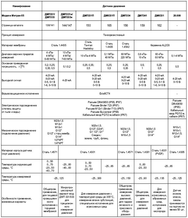 Таблица 2 – Сравнительная таблица характеристик моделей датчиков давления Метран-55