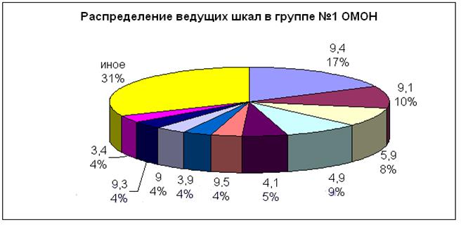 Таким образом, выраженность обидчивости, сензитивности и склонности к подозрительности следует относить прежде всего к частному проявлению особой подгруппы с пиком 6.4 (8% результатов в группе №2 СОБР). Рис. 1 Распределение ведущих шкал личностного профиля в выборке кандидатов в ОМОН УВД ЕАО.