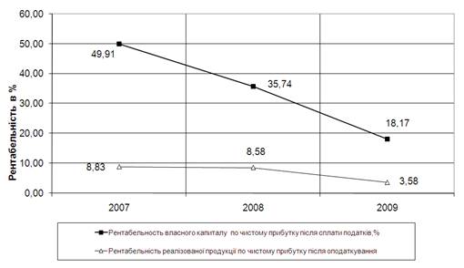 - рентабельність власного акціонерного капіталу підприємства по чистому прибутку після оподаткування з рівня 49,9% у 2007 році поступово знизилась до рівня 18,2% при ринковій доходності капіталу у 2009 році 22,0 -24,0% річних (по ринковій доходності безризикових державних облігацій ОВДП), що робить підприємство інвестиційно непривабливим для залучення додаткового капіталу в статутний фонд підприємства.
