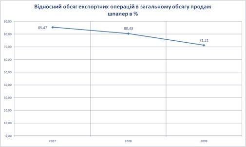 1. Питома вага обсягів вартості експорту з рівня 85, 5% у 2007 році поступово знижувався до рівня 71,21% у 2009 році, тобто все більша частка обсягу реалізації шпалер ЗАТ «Едем» іде на внутрішній ринок України.