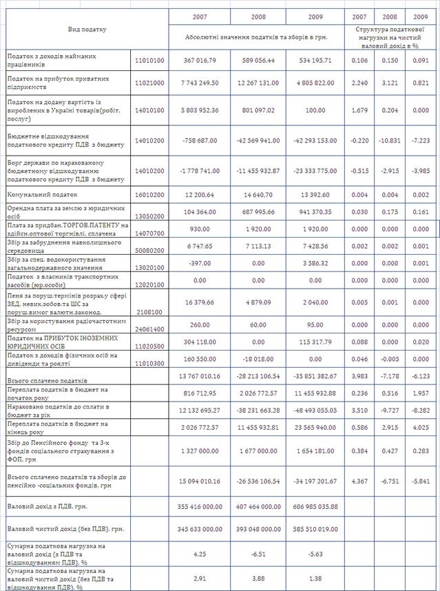 2. За рахунок високої питомої ваги експорту та бюджетного відшкодування експортного ПДВ сумарна сплата податків в бюджет з рівня+15,1 млн.грн. у 2007 році змінилася на доходи від бюджета (-26,5 млн.грн.) у 2008 році та додатково зросла доходами від бюджету (-34,2 млн.грн.) у 2009 році;